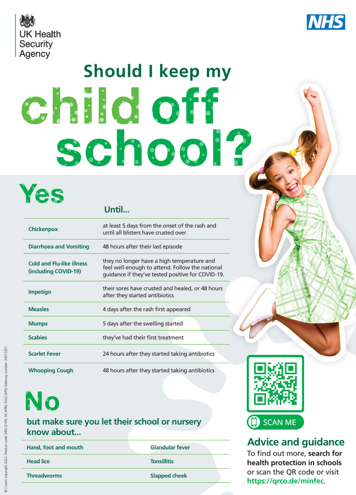 If you are unsure if your child’s illness allows them to attend school, please see the following NHS advice and read our Administration of Medicines Policy. You will find information about conditions that are infectious or contagious and what to do in terms of absence.