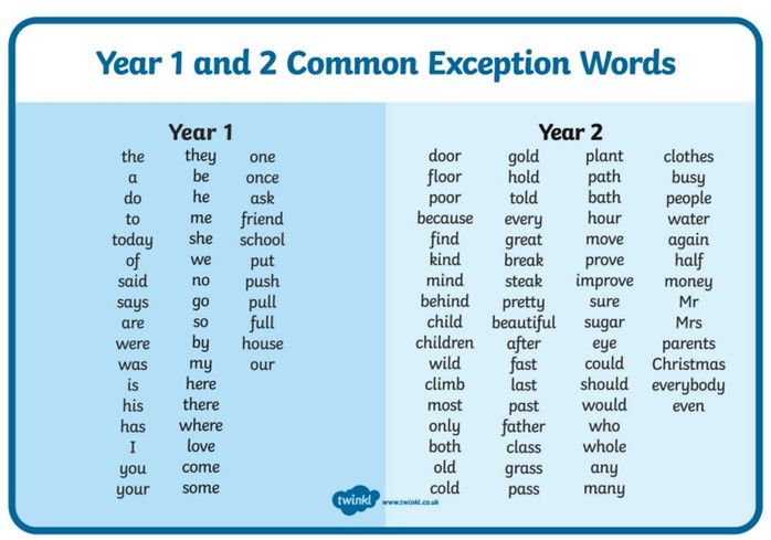 Children in Year 1 and 2 need to learn to read and spell the common exception words below. They will be taught these in daily phonics lessons and will be given opportunities in other learning activities to learn these. These will be the words your child will bring home to learn each week to practise. They need to practise reading and spelling them, as well as apply them in their written work.